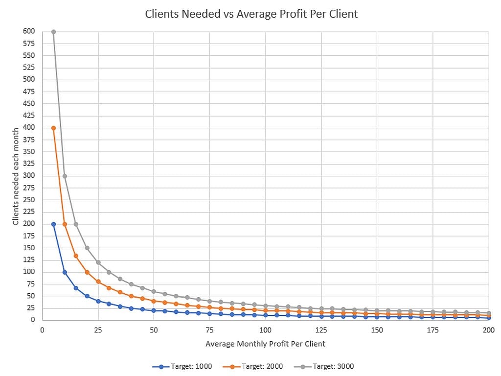 Besides, it takes 50 clients for a freelancer on a £60/month retainer to turn over £3k per month before expenses — but only 30 at £100/month. In fact, the number of clients needed to reach any target turnover increases rapidly at rates below about £75/month. Of course, after expenses, that turnover may not even make them Minimum Wage.
